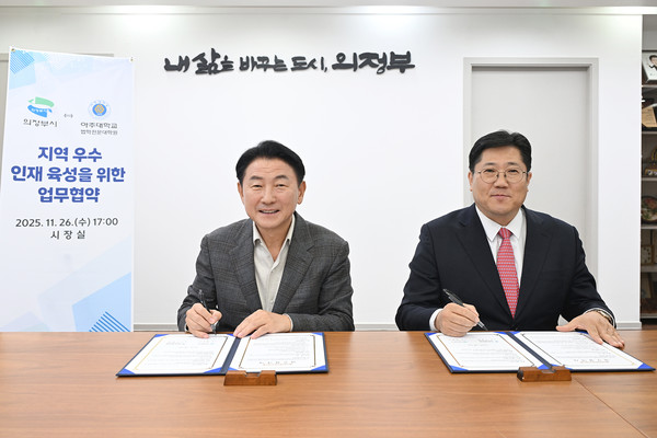 [경기북부탑뉴스 박종국 기자] 의정부시(시장 김동근)는 11월 26일 시장실에서 아주대학교 법학전문대학원(원장 소병천)과 지역 우수 인재 육성과 미래 법조인 양성을 위한 업무협약을 체결했다.